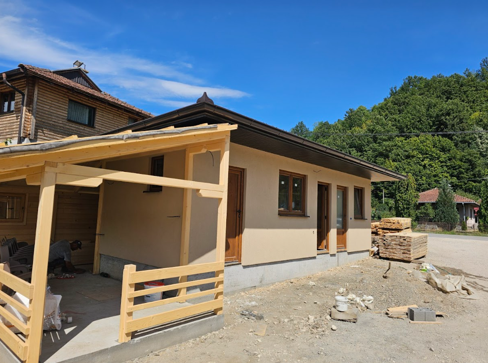 Nakon postavljanja zidnih panela, izvedena je kompletna drvena noseća konstrukcija, čime je objekat dobio stabilnost i čvrstoću. U ovoj fazi objekat je zatvoren spoljašnjim zidovima i konstrukcionim elementima, što omogućava zaštitu od spoljašnjih uticaja i nesmetan nastavak radova. Preciznost montaže posebno dolazi do izražaja kod manjih objekata, gde je svaki detalj važan za ukupni kvalitet.